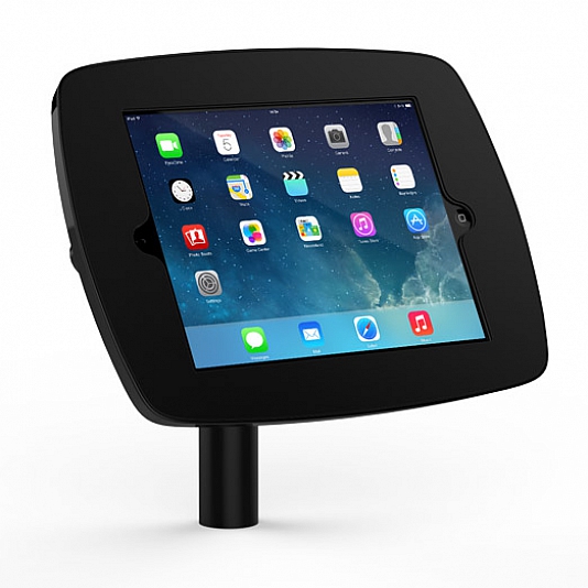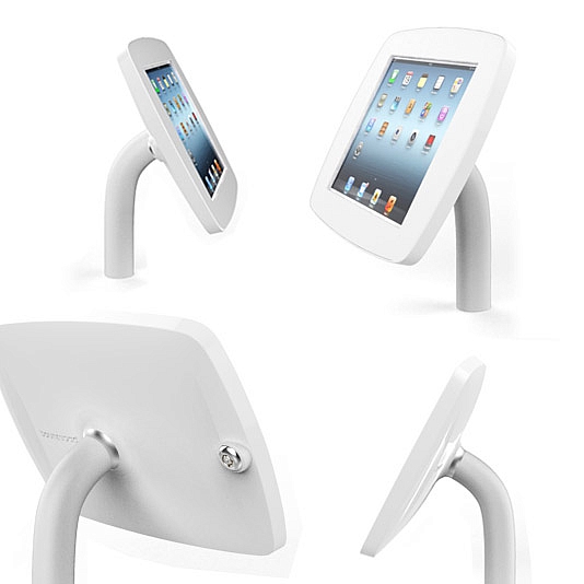 Tablet kiosk houder Static 60 is een stevige staander voor iPad of Galaxy. Display in een hoek van 60°. Kleur wit of zwart, Open of gesloten homebutton, Open of gesloten camera.